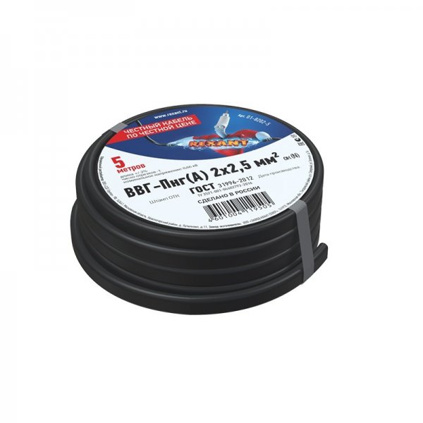 Кабель ВВГ-Пнг(А) 2x2,5 мм², длина 5 метров, ГОСТ REXANT