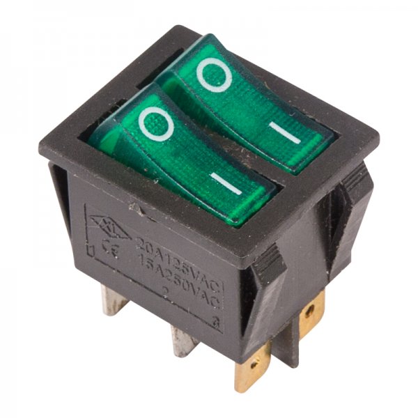 Выключатель клавишный 250V 15А (6с) ON-OFF зеленый с подсветкой ДВОЙНОЙ предназначен для коммутации электрических цепей переменного тока напряжением до 250В. Клавишные (Рокерные) выключатели применяются в качестве комплектующих изделий различного электрооборудования (в сетевых фильтрах и удлинителях, аудио-оборудовании, блоках питания, электроустановках на различных производствах, автомобилях, и многих других местах). Такой клавишный переключатель имеет два положения и две клавиши, что позволит раздельно коммутировать контактные группы. Принцип действия основан на перемещении клавиши в одну из позиций. Для переключения в нужное положение требуется приложить некоторые усилия на клавишу. Монтаж осуществляется без применения винтов на плоских панелях толщиной от 0.8мм до 3мм. Подключение контактов осуществляется плоской клеммой 6.6мм, либо с помощью пайки.