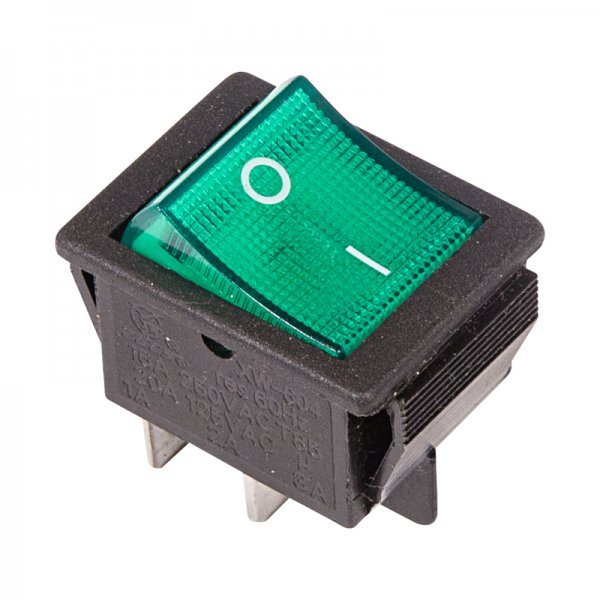Выключатель клавишный 250V 16А (4с) ON-OFF зеленый с подсветкой предназначен для коммутации электрических цепей переменного тока напряжением до 250В. Клавишные (Рокерные) выключатели применяются в качестве комплектующих изделий различного электрооборудования (в сетевых фильтрах и удлинителях, аудио-оборудовании, блоках питания, электроустановках на различных производствах, автомобилях, и многих других местах). Такой клавишный переключатель имеет два положения. Принцип действия основан на перемещении клавиши в одну из позиций. Для переключения в нужное положение требуется приложить некоторые усилия на клавишу. Монтаж осуществляется без применения винтов на плоских панелях толщиной от 0.8мм до 3мм. Подключение контактов осуществляется плоской клеммой 6.6мм, либо с помощью пайки.