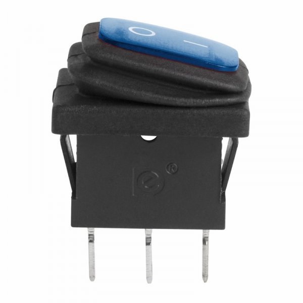 Выключатель клавишный 250V 6А (3с) ON-OFF синий с подсветкой Mini ВЛАГОЗАЩИТА предназначен для коммутации электрических цепей переменного тока напряжением до 250В в условиях повышенной влажности. Клавишные (Рокерные) выключатели применяются в качестве комплектующих изделий различного электрооборудования (в сетевых фильтрах и удлинителях, аудио-оборудовании, блоках питания, электроустановках на различных производствах, автомобилях, и многих других местах). Защитная оболочка клавиши обеспечивает влаго и пылезащиту механизма переключения. Такой клавишный переключатель имеет два положения. Принцип действия основан на перемещении клавиши в одну из позиций. Для переключения в нужное положение требуется приложить некоторые усилия на клавишу. Монтаж осуществляется без применения винтов на плоских панелях толщиной от 0.8мм до 3мм. Подключение контактов осуществляется плоской клеммой, либо с помощью пайки.