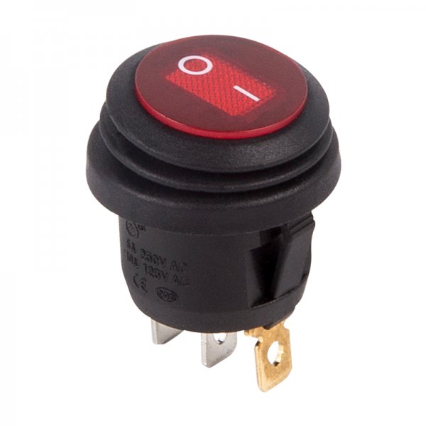 Выключатель клавишный круглый 250V 6А (4с) ON-OFF красный с подсветкой ВЛАГОЗАЩИТА предназначен для коммутации электрических цепей переменного тока напряжением до 250В в условиях повышенной влажности. Клавишные (Рокерные) выключатели применяются в качестве комплектующих изделий различного электрооборудования (в сетевых фильтрах и удлинителях, аудио-оборудовании, блоках питания, электроустановках на различных производствах, автомобилях, и многих других местах). Защитная оболочка клавиши обеспечивает влаго и пылезащиту механизма переключения. Такой клавишный переключатель имеет два положения. Принцип действия основан на перемещении клавиши в одну из позиций. Для переключения в нужное положение требуется приложить некоторые усилия на клавишу. Монтаж осуществляется без применения винтов на плоских панелях толщиной от 0.8мм до 3мм. Подключение контактов осуществляется плоской клеммой, либо с помощью пайки.