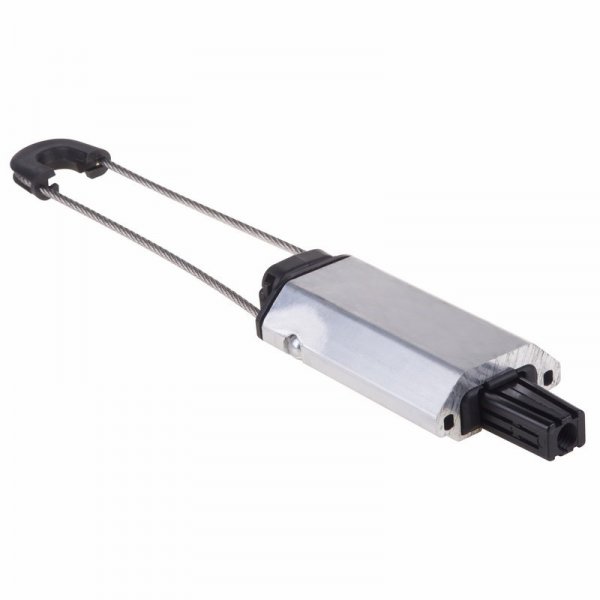 Корпус зажима изготовлен из коррозионностойкого экструдированного алюминиевого сплава, тросик из нержавеющей стали с шаровыми креплениями на обоих концах для удобства надежной фиксации. Внутренняя часть и саморегулирующиеся клинья из армированного диэлектрического пластика, устойчивого к ультрафиолетовому излучению. Не требуется инструмент для монтажа.