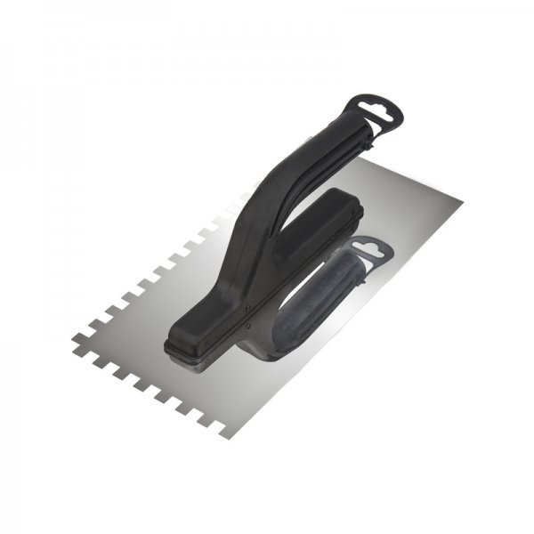 Гладилка прямая (зубчатая) изготовлена из нержавеющей стали, оснащена эргономичной пластиковой ручкой. Используется для качественного нанесения различных сухих смесей, их распределения по поверхности, а также сглаживания неровностей и швов. В ремонтных, а также отделочных работах гладилка малярная и штукатурная используется повсеместно. Она незаменима в случаях, когда необходимо нанести много раствора тонким слоем.