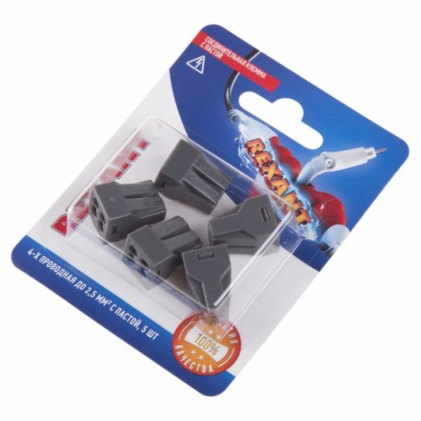 Электромонтажные экспресс-клеммы предназначены для соединения 4 проводов между собой (алюминиевые и медные как одножильные, так и многожильные). Подключение осуществляется способом проталкивания до упора очищенного от изоляции провода в свободное гнездо. Клеммы наполнены специальной контактной пастой, которая создает барьер для попадания влаги внутрь разъёма, а так же препятствует окислению проводников. Клемма имеет 4 контакта, напряжение 400 В, Максимальным током 24А,