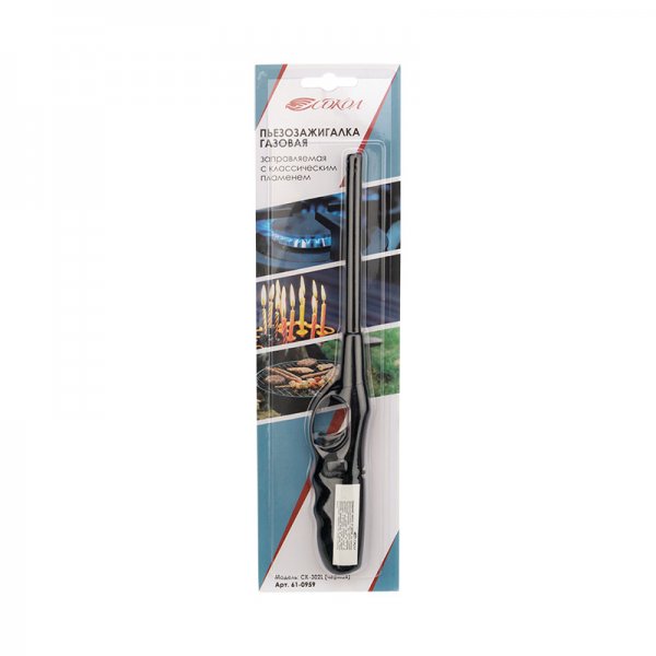 Бытовая газовая пьезозажигалка с классическим пламенем. Тип поджига — пьезоэлектрический. Общие габариты зажигалки: 258х33х21 мм Цвет: черный