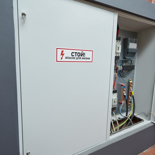 Знак электробезопасности (наклейка) «Стой! Опасно для жизни» - это информационный знак, который размещается для сообщения об опасности поражения электротоком, на дверях и стенах помещений, на дверцах электрощитовых шкафов. Такие наклейки предназначены для предупреждения и информирования окружающих, а также для организации мест работы электромонтажных бригад, несут дополнительную информационную нагрузку. Знак изготовлен на основе самоклеящейся пленки, предназначенной для информационных знаков на улице и в помещениях.