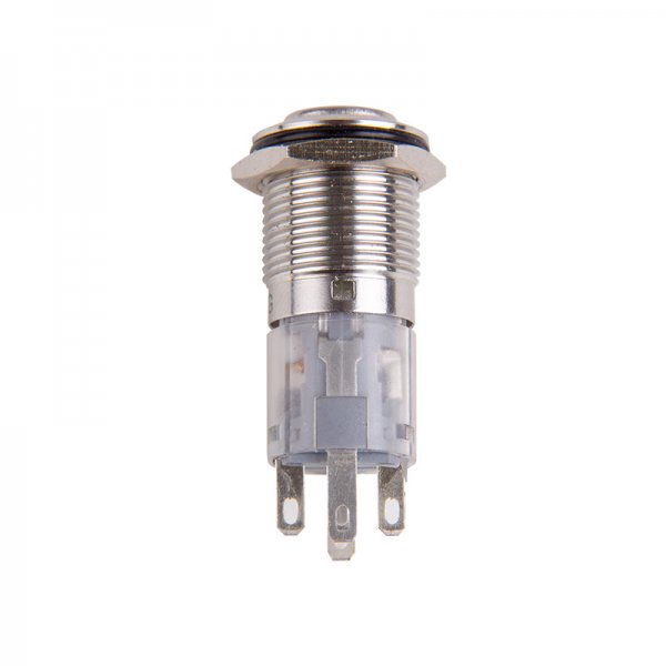 Кнопка антивандальная Ø16 12В Фикс (5с) ON-OFF/OFF-ON синяя предназначена для коммутации электрических цепей напряжением до 12В путем включения-выключения питающего провода. Металлические кнопки применяются в местах, где существует большой риск их повреждения (на различных производственных линиях, в лифтовых кабинах, около входной двери и т.д.), а также для декоративного оформления панелей управления. Главными отличительными особенностями такой кнопки являются металлическое исполнение и неуязвимость контактной группы, что обеспечит ей долговечное функционирование. Изделие состоит из двух основных частей - лицевой части (головки) и контактной, и имеет пружинный возвратный механизм. Монтаж осуществляется без применения винтов на плоских панелях толщиной от 0.5мм до 10мм. Подключение проводов осуществляется с помощью винтовых зажимов, пайки или разъемом.
